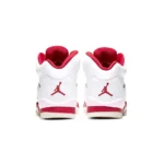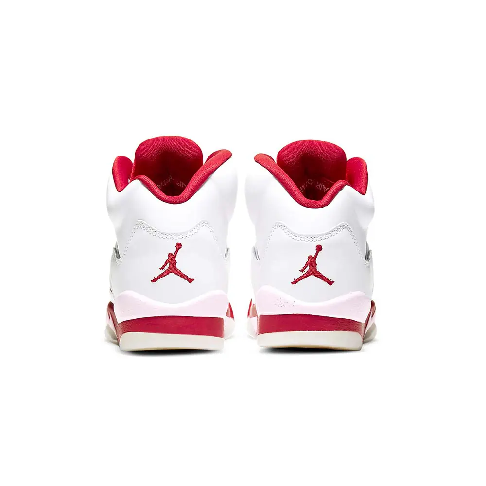 This Air Jordan 5 comes dressed in a White, Pink Foam, and Gym Red color combination. Looking closer it features White leather across the uppers while Pink Foam is applied to the netting on the panels, tongue, and on part of the midsole. Following we have Red on the top of the tongue, liner, and most of the midsole while a milky translucent outsole finishes the look.