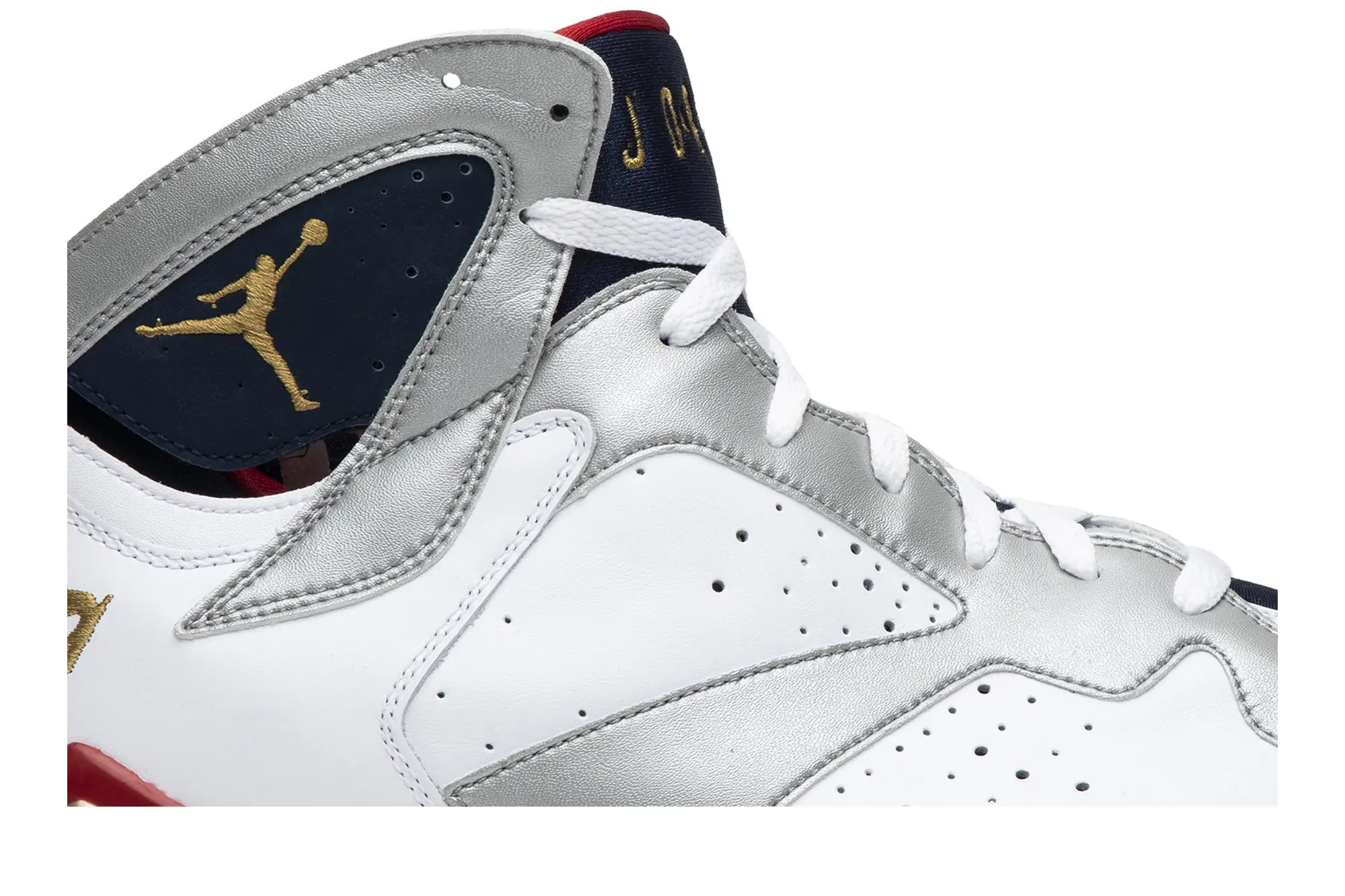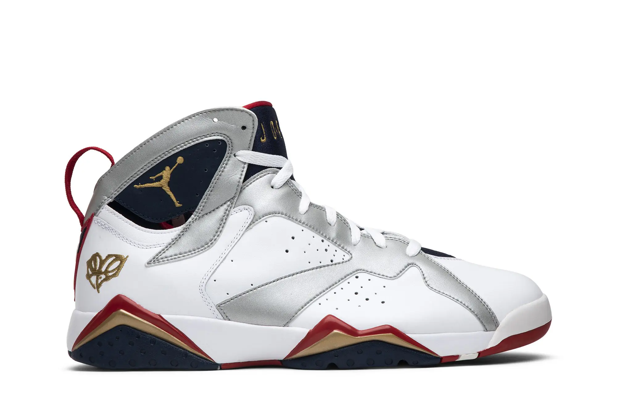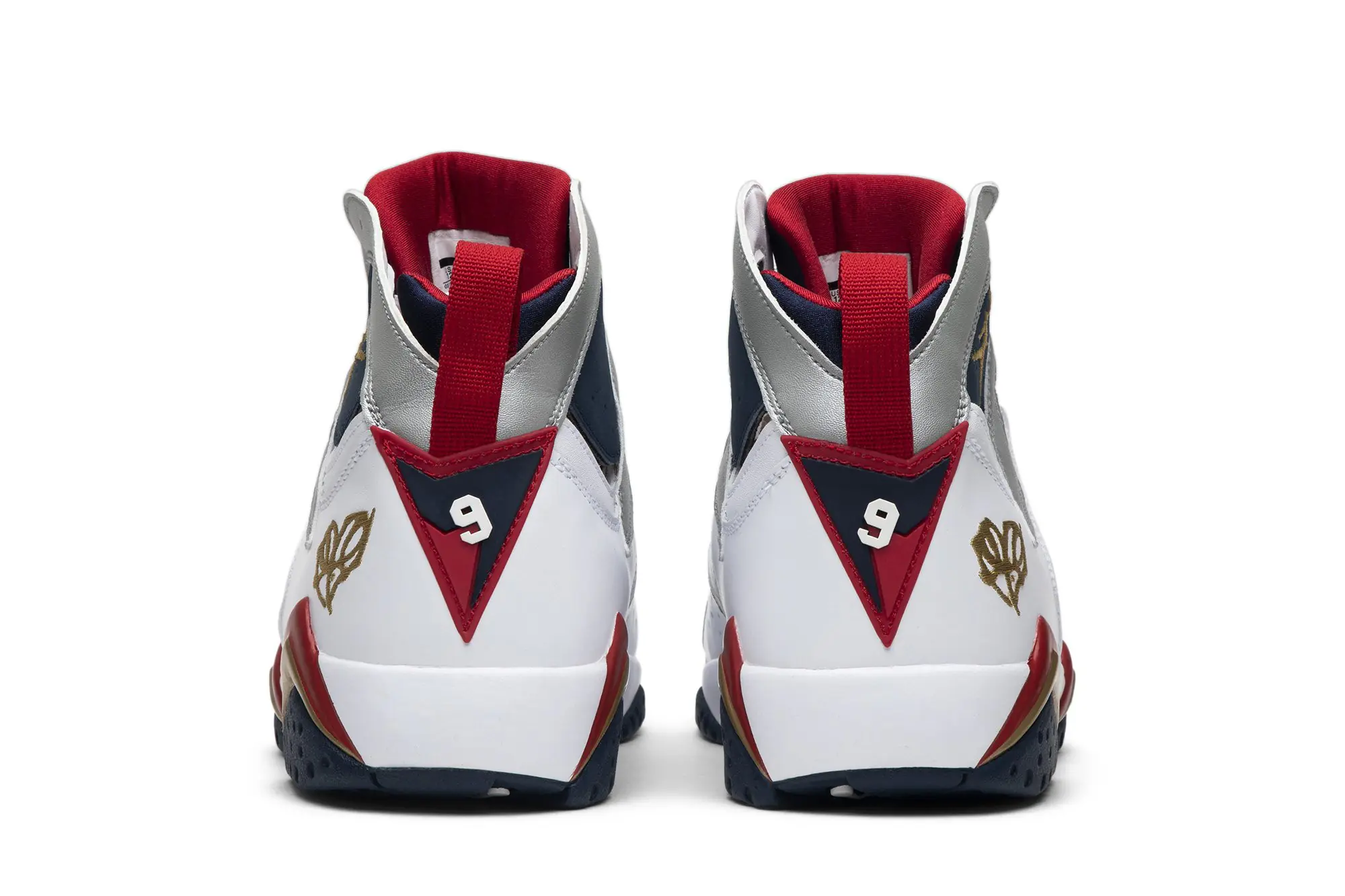 Drawing from previous Olympic colorways, the Air Jordan 7 Retro ‘For The Love Of The Game’ builds on a long-standing tradition of celebrating the Team USA. The sneaker features a white leather upper with perforations on the sidewall and silver overlays on the eyestay and collar. The mid top also sports red and navy accents on the collar, heel, and midsole, as well as metallic gold details on the branding. A stitched heart logo in gold adorns the side profile.