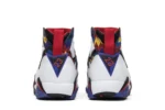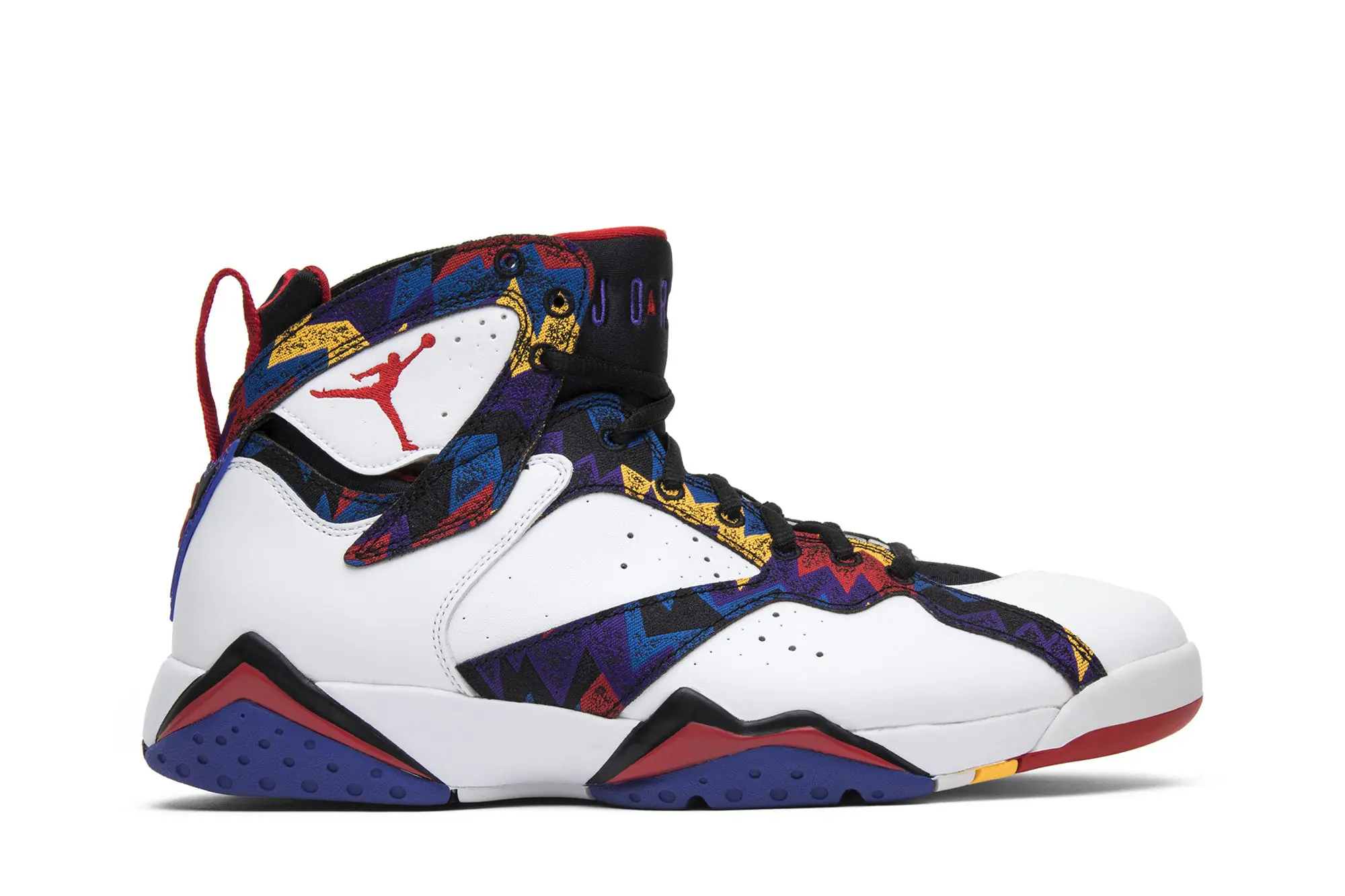 The Nike Air Jordan 7 Retro ‘Sweater’ was inspired by an Air Jordan shirt and shorts combo worn by Michael Jordan at the 1992 Barcelona Summer Olympics and in a 1993 McDonald’s Super Bowl commercial with Larry Bird. Also known as the ‘Nothing But Net,’ the 2015 release combines a vivid graphic print with white leather on the upper, and black, University Red, and Bright Concord accents at the tongue, heel tab, and outsole.